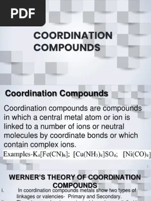Coordination compounds have two parts, the central metal …. .. The solid or liquid state of metals largely originates in the capacity of the metal atoms involved to …